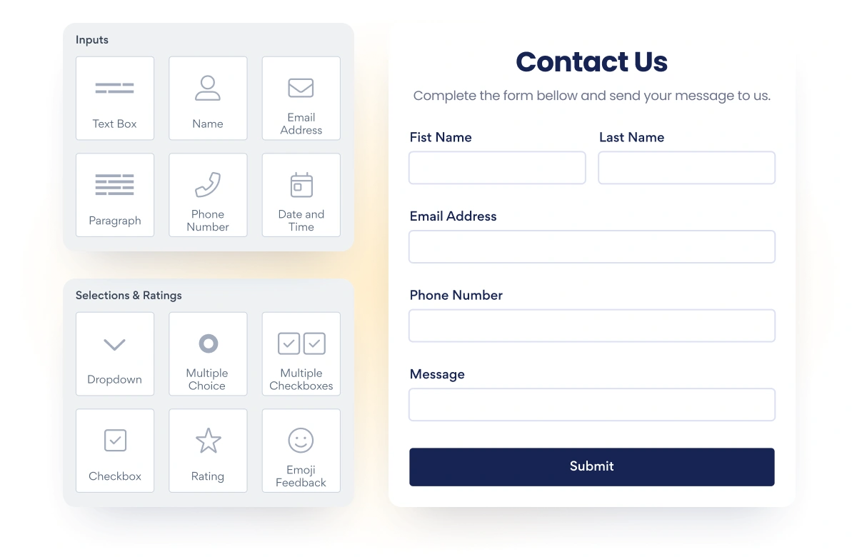 20+ form elements like dropdown, multiple-choice, images, star ratings, file uploads, emoji feedback & more.