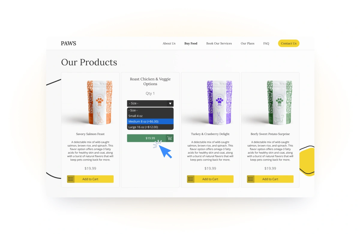 Add different products, descriptions, product images, product options and prices so your customers can select size, quantity and add custom instructions at checkout.