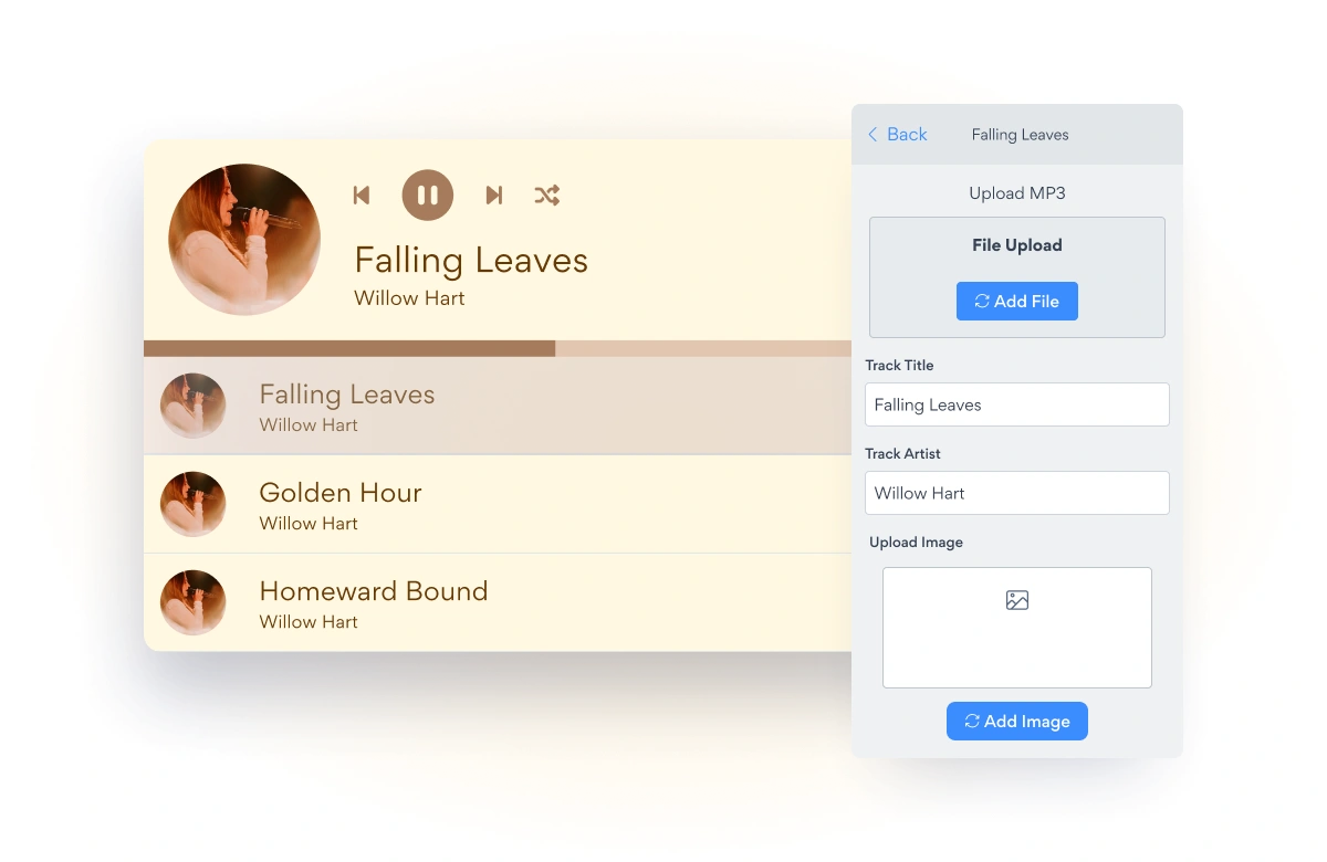 Add as many songs as you like to your custom music player for your website. Upload from Soundcloud or MP3s from your computer.