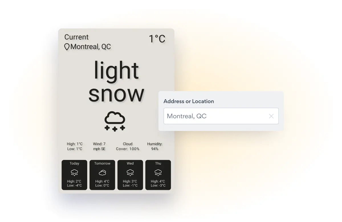 Add locations from anywhere on Earth with current temperature, high and low, cloud cover, precipitation, wind speed, and humidity percentage.